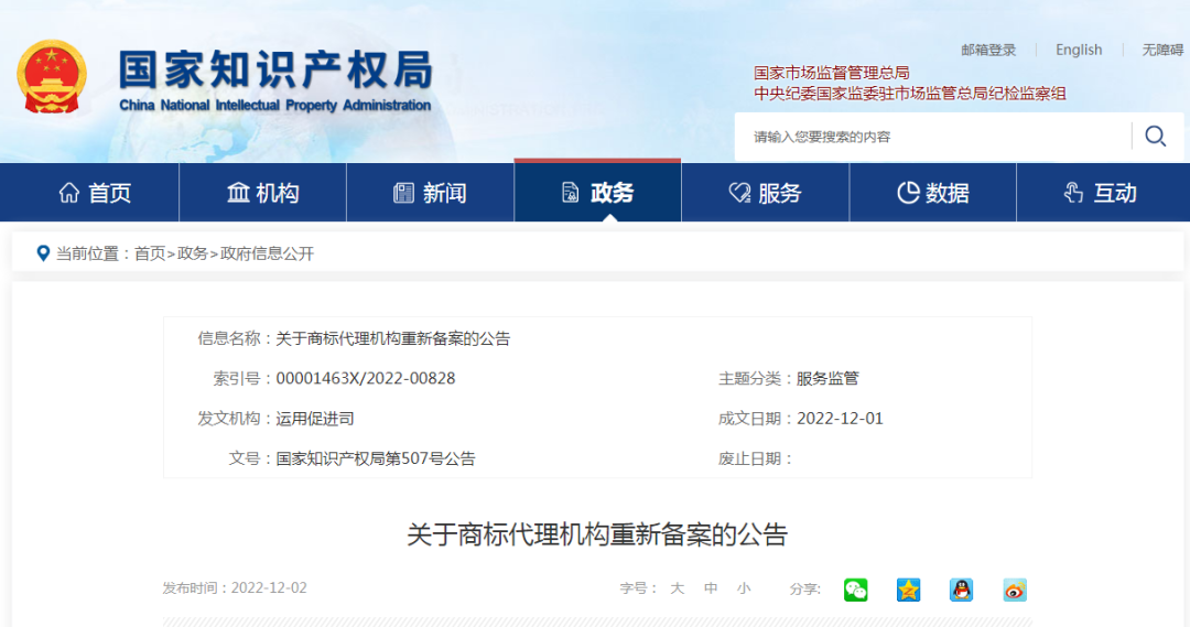 “近日,国家知识产权局发布了关于商标代理机构重新备案的公告,公告提到:重新备案的机构应当在2023年1月1日至2023年2月28日期间提交重新备案申请,国家知识产权局于2023年3月31日前完成重新备案;对符合要求的,国家知识产权局及时予以备案,通知有关机构并公开发布。”